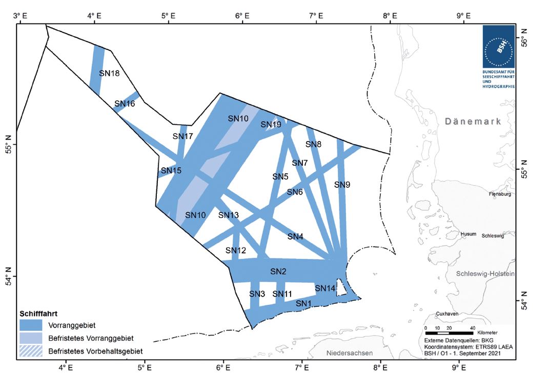 Im 2. Planentwurf wurden Forderungen zur Schifffahrt übernommen. Dabei wurde die Route SN18 zur Sicherung der nordgehenden Verkehre ergänzt. Dies ist eine Fortführung der entsprechenden Routen in Dänemark und in den Niederlanden. Zusätzlich wurden mit SN19 und SO5 befristete Vorbehaltsgebiete Schifffahrt in Gebieten eingeführt, welche auch für die Windenergie geeignet wären. Diese Lösung der Befristung stellt sicher, dass ausreichend Zeit besteht, die Verkehrssituation in den Gebieten zu analysieren und die Erforderlichkeit der Festlegung zu prüfen. Als Grundlage für den Nachweis soll ein Gutachten beauftragt werden. Im Hinblick auf Beeinträchtigungen durch andere Nutzungen bezüglich der Route SO2 wird auf den Vorrang der Schifffahrt im Vorranggebiet Naturschutz, den Grundsatz der gegenseitigen Rücksichtnahme und nachfolgende Planungs- und Zulassungsverfahren verwiesen.
