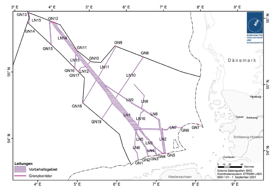 Der Grenzkorridor GN7 zum schleswig-holsteinischen Küstenmeer wurde aufgenommen, ebenso wie die Grenzkorridore zu den Nachbarstaaten. Bei den Leitungskorridoren wurden nur geringfügige Anpassungen vorgenommen und darüber hinaus darauf hingewiesen, dass weiterhin einzelne bestehende Strom- und Datenkabel nicht nachgezeichnet werden, da eine räumliche Sicherung nicht erforderlich sei und die Detailplanung im Rahmen der Fachplanung erfolge. Die Führung von Leitungen durch Schutzgebiete wird so weit wie möglich vermieden, für technische Aspekte wird auf die Fachplanung verwiesen. Wirtschaftliche Aktivitäten, zu denen die Leitungsinfrastruktur zu rechnen ist, sollen die Landes- und Bündnisverteidigung so wenig wie möglich beeinträchtigen, in der Begründung wird dazu auf die Konkretisierung im Fachrecht verwiesen.