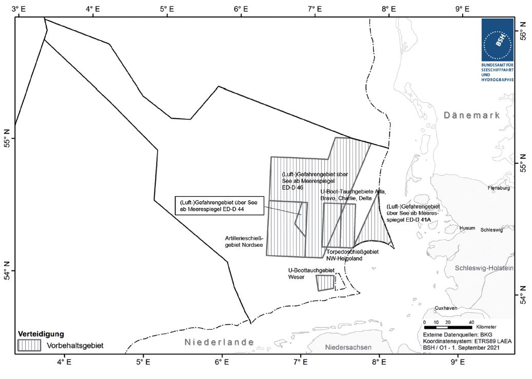 Die im Plan dargestellten militärischen Übungsgebiete wurden als Vorbehaltsgebiete gemäß ihrer militärischen Zwecke festgelegt, da die zwischenzeitliche rechtliche Prüfung zu dem Ergebnis kam, dass die Ausweisung von Vorbehaltsgebieten für Landes- und Bündnisverteidigung mit dem SRÜ vereinbar ist.