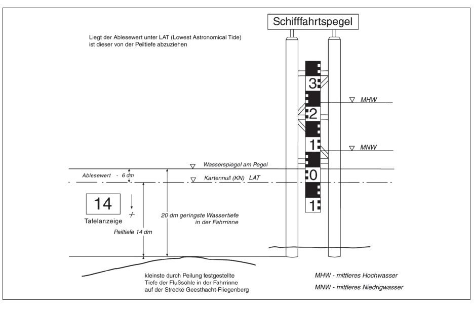 | An beiden Seiten des Mittefahrwasserzeichens ist eine der zugelassenen Abladetiefe entsprechende Wassertiefe vorhanden. | |||||