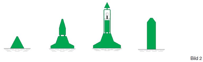 | Toppzeichen (wenn vorhanden): | grüner Kegel - Spitze oben - (in der Regel als Radarreflektor) | |||