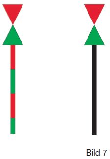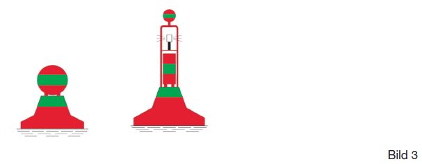 | Erforderlichenfalls zeigt ein rotes zylinderförmiges oder ein grünes kegelförmiges Toppzeichen über dem Zeichen für die Fahrrinnenspaltung an, an welcher Seite die Vorbeifahrt erfolgen soll. | ||||