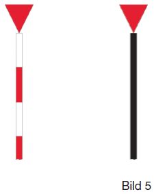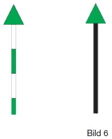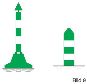 | Im Bereich einer Abzweigung, Einmündung und Hafeneinfahrt kann für jede Seite der Wasserstraße die Ufersicherung bis zur Trennspitze durch die unter den Nummern 1 und 2 (Bilder 5 und 6) gezeigten festen Schifffahrtszeichen gekennzeichnet werden. Die Fahrt von der Hafeneinfahrt in den Hafen gilt als Bergfahrt. | ||||