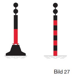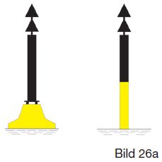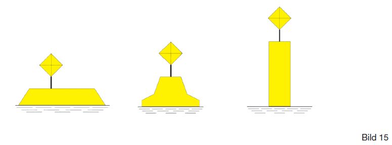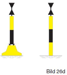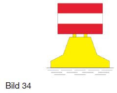 | Gelbe Stumpftonnen (Bild 33) oder gelbe Tonnen (Bild 34) mit oder ohne Radarreflektoren oder mit oder ohne Toppzeichen kennzeichnen eine gesperrte Wasserfläche. Als Toppzeichen können insbesondere die Zeichen nach Anlage 7 in Form von Tafeln oder Zylindern verwendet werden. | |||||