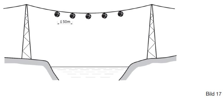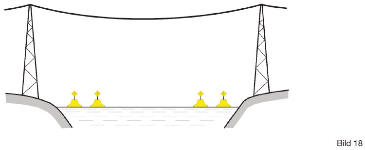 | 2. | Radarreflektoren auf gelben Tonnen an beiden Ufern paarweise ausgelegt (ergeben im Radarbild je zwei nebeneinander liegende Punkte zur Identifizierung der Freileitung) | ||||