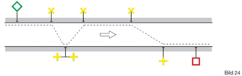 | Die Positionen rechte Seite der durchgehenden Fahrrinne/rechte Seite der abzweigenden oder einmündenden Fahrrinne und linke Seite der durchgehenden Fahrrinne/linke Seite der abzweigenden oder einmündenden Fahrrinne werden mit den Zeichen nach Bild 1 und Bild 2 bezeichnet. | ||||