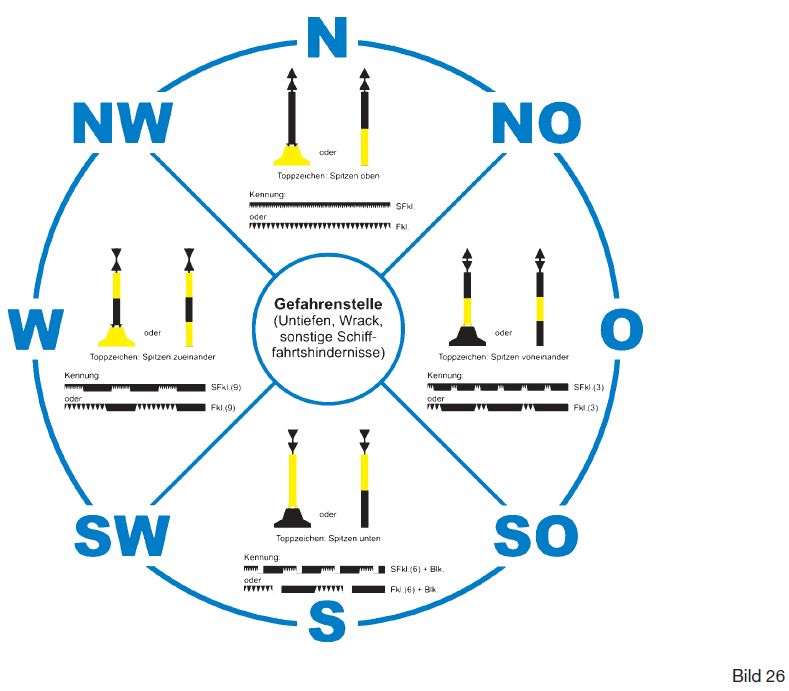 | Eine allgemeine Gefahrenstelle (z. B. Untiefe, Wrack, Buhne und sonstiges Schifffahrtshindernis) ist in der Regel mit einem oder mehreren Kardinalzeichen bezeichnet, die für die verschiedenen Quadranten den Bezug zur Lage der Gefahrenstelle angeben. | |||||