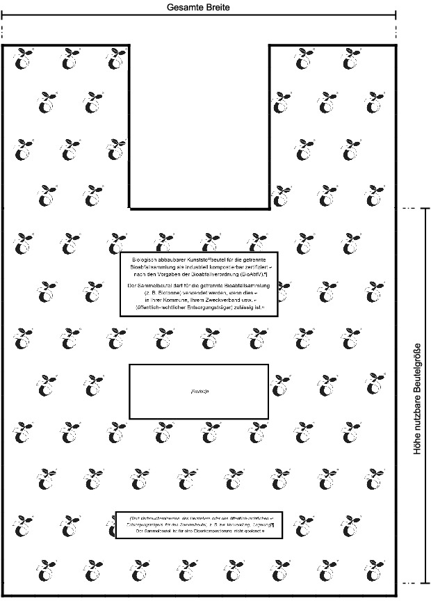 Auf der Vorderseite ist ein gerahmtes viereckiges Textfeld mit den Maßen 70 mm Höhe und 170 mm Breite (jeweils Rahmenaußenkante) und einer Rahmenstärke von 4 Punkt (pt) einzufügen. Das Textfeld ist vertikal im Abstand von 45 mm von der oberen Rahmenaußenkante zur Oberkante der nutzbaren Beutelgröße und horizontal zentriert zu platzieren. Das Textfeld ist mit folgenden Hinweisen zur Konformität mit der BioAbfV und zur Zulässigkeit der Verwendung zu beschriften: