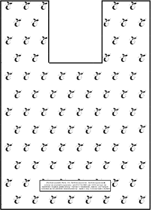 Sammelbeutel jeglicher Größe sind über die gesamte Fläche der Vorder- und Rückseite einschließlich der Tragegriffe, mit Ausnahme der Textfelder und des Freifeldes, mit dem Logo „Keimling“ nach Nummer 2.2 zu bedrucken. Bei Sammelbeuteln mit den Referenzmaßen nach Nummer 3.1.1 ist das Logo „Keimling“ mit den Referenzmaßen gemäß Nummer 3.1.2 horizontal im Abstand von jeweils 25 mm und vertikal mit einem Zeilenabstand von jeweils 25 mm in zeilenweise versetzter Anordnung zu drucken. Bei abweichenden Maßen des Sammelbeutels gelten für den Aufdruck des Logos „Keimling“ die Vorgaben nach Nummer 4.1.