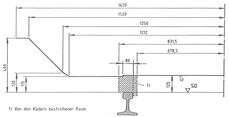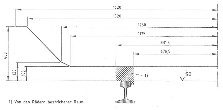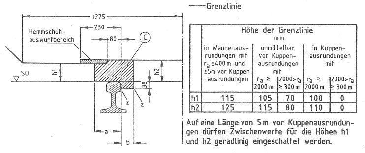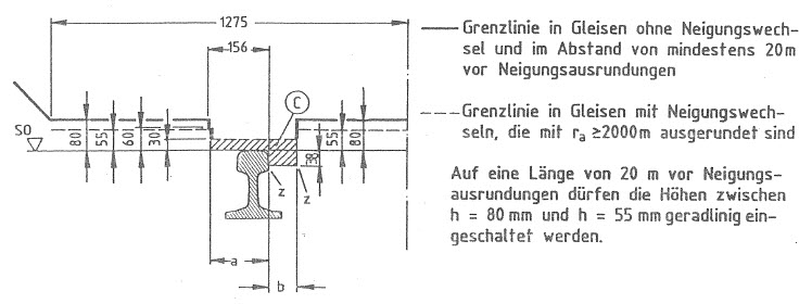 | Höhe der Bezugslinie | bei nicht festgelegtem Gleis | bei festgelegtem Gleis | bei festgelegtem Gleis und einem Überhöhungs- oder Querhöhenfehler ≤ 5 mm | |||
