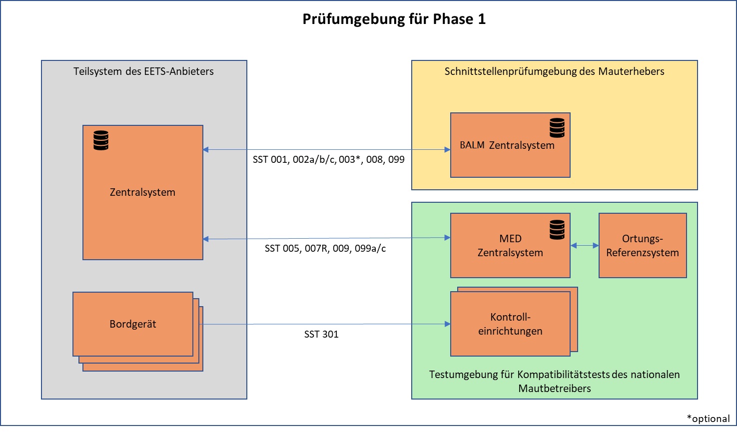 | P1-SSP-002 | technische Prüfung der Schnittstellen zwischen BALM Zentralsystem und EETS-Anbieter (SST 001, SST 002, SST 008, SST 099) | korrekter Kommunikationsablauf |