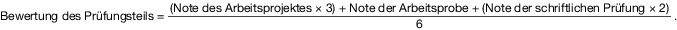 (2) Die Bewertung der Leistung des Prüfungsteils „Baumdiagnose und Baumpflegemaßnahmen“ errechnet sich aus den Noten der Prüfungsbestandteile Arbeitsprojekt (§ 8), Arbeitsprobe (§ 9) und schriftliche Prüfung (§ 10) nach folgender Formel: