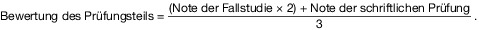 (3) Die Bewertung der Leistung des Prüfungsteils „Betriebs- und Unternehmensführung“ errechnet sich aus den Noten der Prüfungsbestandteile Fallstudie (§ 13) und schriftliche Prüfung (§ 14) nach folgender Formel: