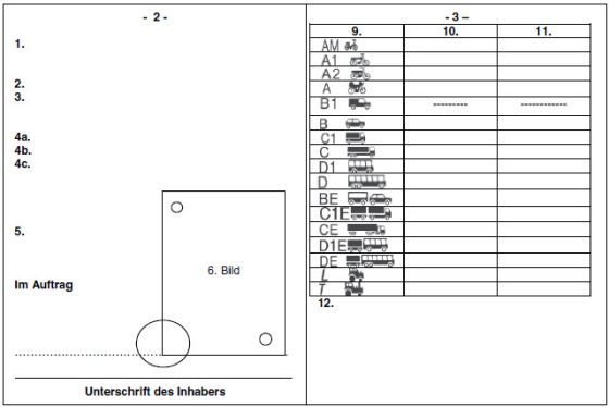 Folgende Daten zum Inhaber des Führerscheins und zu seiner Fahrerlaubnis entsprechend der auf dem Führerschein aufgebrachten Nummerierung; Nummer 8 (Wohnort) ist nicht vorhanden, da die Angabe nach der Richtlinie 2006/126/EG fakultativ ist und im deutschen Führerschein nicht ausgewiesen wird: