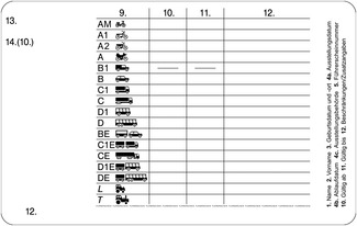 Das Datum der Erteilung der Fahrerlaubnis der jeweiligen Fahrerlaubnisklasse. Das Erteilungsdatum einzelner oder mehrerer Fahrerlaubnisklassen kann auch im Feld 14 unter Angabe der Nummer 10 eingetragen sein. In diesen Fällen wird in der Spalte 10 mittels „*)“ darauf verwiesen.