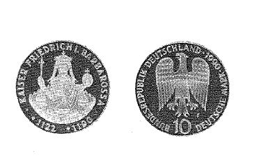 (1) Auf Grund des § 6 des Gesetzes über die Ausprägung von Scheidemünzen in der im Bundesgesetzblatt Teil III, Gliederungsnummer 690-1, veröffentlichten bereinigten Fassung hat die Bundesregierung beschlossen, zum 800. Todestag von Kaiser Friedrich I. Barbarossa im Jahre 1990 eine Bundesmünze (Gedenkmünze) im Nennwert von 10 Deutschen Mark prägen zu lassen. Die Auflage der Münze beträgt 7,85 Millionen Stück. Die Prägung erfolgt in der Staatlichen Münze Stuttgart.