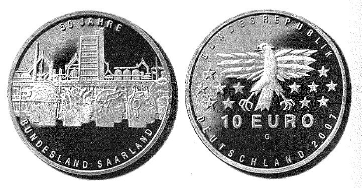 Gemäß den §§ 2, 4 und 5 des Münzgesetzes vom 16. Dezember 1999 (BGBl. I S. 2402) hat die Bundesregierung beschlossen, zur Würdigung der 50-jährigen Zugehörigkeit des Saarlandes zur Bundesrepublik Deutschland eine deutsche Euro-Gedenkmünze im Nennwert von 10 Euro prägen zu lassen.