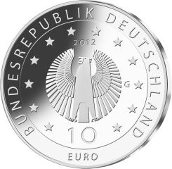 Die Wertseite der Gedenkmünze zeigt einen Adler, die Umschrift „BUNDESREPUBLIK DEUTSCHLAND 2012“ mit den zwölf Europasternen und der Wertbezeichnung „10 Euro“ sowie dem Münzzeichen „G“ der Staatlichen Münzen Baden-Württemberg, Prägestätte Karlsruhe, links neben dem Adler. Auf der Wertseite der Münze in Spiegelglanzqualität ist zusätzlich die Angabe „SILBER 625“ aufgeprägt.