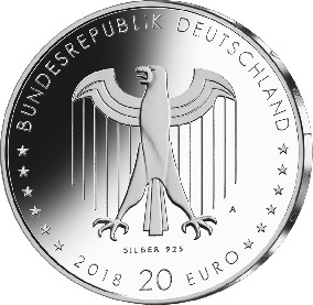 Die Wertseite zeigt einen Adler, den Schriftzug „BUNDESREPUBLIK DEUTSCHLAND“, Wertziffer und Wertbezeichnung, das Prägezeichen „A“ der Staatlichen Münze Berlin, die Jahreszahl 2018 sowie die zwölf Europasterne. Zusätzlich ist die Angabe „SILBER 925“ aufgeprägt.