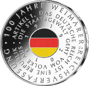 Gemäß den §§ 2, 4 und 5 des Münzgesetzes vom 16. Dezember 1999 (BGBl. I S. 2402) hat die Bundesregierung beschlossen, zum Thema „100 Jahre Weimarer Reichsverfassung“ eine deutsche Euro-Gedenkmünze im Nennwert von 20 Euro prägen zu lassen. Die Münze würdigt das 100. Jubiläum des Inkrafttretens der ersten demokratischen Verfassung Deutschlands.