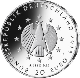 Die Wertseite zeigt einen Adler, den Schriftzug „BUNDESREPUBLIK DEUTSCHLAND“, Wertziffer und Wertbezeichnung, das Prägezeichen „A“ der Staatlichen Münze Berlin, die Jahreszahl 2019 sowie die zwölf Europasterne. Auf der Wertseite der Münze ist zusätzlich die Angabe „SILBER 925“ aufgeprägt.