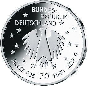 Die Wertseite zeigt einen Adler, den Schriftzug „BUNDESREPUBLIK DEUTSCHLAND“, Wertziffer und Wertbezeichnung, das Prägezeichen „D“ des Bayerischen Hauptmünzamtes, München, die Jahreszahl 2022 sowie die zwölf Europasterne. Zusätzlich ist die Angabe „SILBER 925“ aufgeprägt.