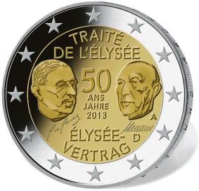 Die nationale Seite zeigt stilisierte Porträts der Unterzeichner des Élysée-Vertrages, dem damaligen Bundeskanzler der Bundesrepublik Deutschland, Konrad Adenauer und dem früheren Präsidenten der Französischen Republik, Charles de Gaulle, deren Unterschriften sowie die Angabe „50 ANS JAHRE“ mit der Jahreszahl „2013“ im mittleren Teil, den Schriftzug „TRAITÉ DE L´ÉLYSÉE“ im oberen Teil und den Schriftzug „ÉLYSÉE-VERTRAG“ im unteren Teil. Auf der rechten Seite des inneren Kerns befinden sich ferner das Prägezeichen („A“, „D“, „F“, „G“ oder „J“) der jeweiligen Münzstätte sowie die Länderkennung „D“ der Bundesrepublik Deutschland. (Die nationale Seite dieser Münze, die motivgleich von Deutschland und Frankreich herausgegeben wird, unterscheidet sich in den beiden Ausgabeländern nur durch die Länderkennung und nationale Münz- beziehungsweise Graveurszeichen).