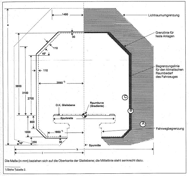 Bereiche B (Raumbedarf für Toleranzen des Fahrwegs und dessen Linienführung) und C (Kinematischer Raumbedarf des Fahrzeugs): Zulässig sind Einragungen nur während des Fahrgastwechsels sowie während des Reinigens und der Instandhaltung von Fahrzeugen.