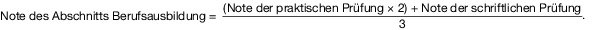(4) Im Prüfungsteil „Berufsausbildung und Mitarbeiterführung“ ist zunächst eine Note für die Bewertung des Abschnitts „Berufsausbildung“ aus der Note der praktischen Prüfung (§ 16) und der Note der schriftlichen Prüfung (§ 17) nach folgender Formel zu bilden: