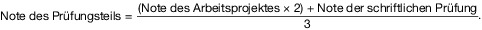(2) Die Note des Prüfungsteils „Prozess- und Verfahrenstechnik“ errechnet sich aus den Noten der Prüfungsbestandteile Arbeitsprojekt (§ 8) und schriftliche Prüfung (§ 9) nach folgender Formel: