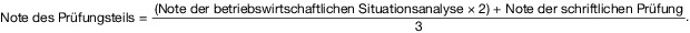 (3) Die Note des Prüfungsteils „Betriebs- und Unternehmensführung“ errechnet sich aus den Noten der Prüfungsbestandteile betriebswirtschaftliche Situationsanalyse (§ 12) und schriftliche Prüfung (§ 13) nach folgender Formel: