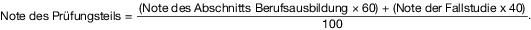 Anschließend ist für die Bewertung des Prüfungsteils „Berufsausbildung und Mitarbeiterführung“ eine Note aus der gerundeten Note des Abschnitts „Berufsausbildung“ nach Satz 1 und der Note der Fallstudie (§ 18) nach folgender Formel zu bilden: