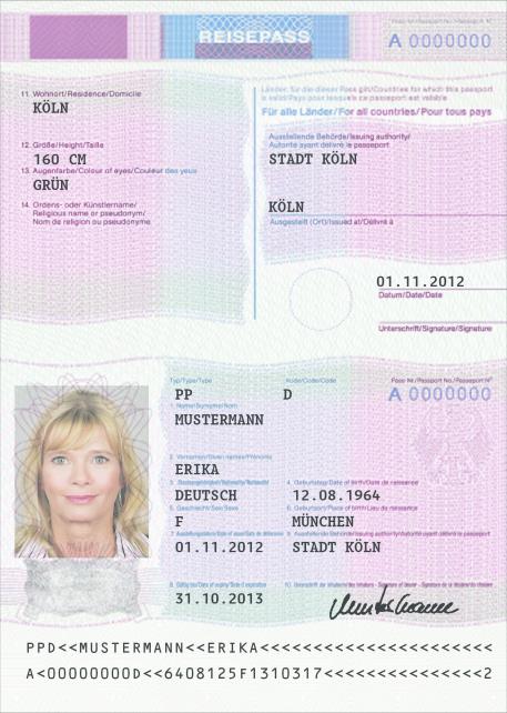 | Reisepass (32 Seiten) | Passbuchinnenseiten 12 und 13 |