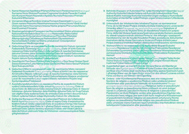 | Feld Nr. | Feldbezeichnung | Schriftgröße 1 Schriftfont des Passherstellers Schriftgröße 2,0 mm | Schriftgröße 2 Schriftfont des Passherstellers Schriftgröße 1,3 mm | |||