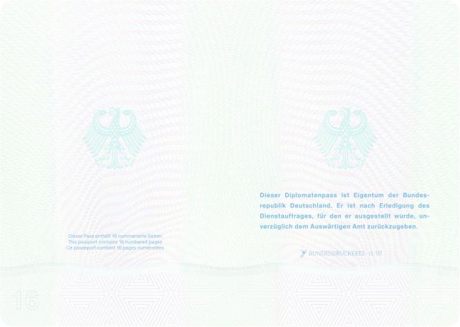 | Vorläufiger Diplomatenpass | Passbuchinnenseite 16 und Vorsatz |
