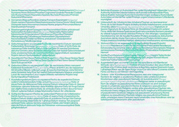 | Die Seiten 1 bis 16 und die hintere Passdecke werden am unteren Rand mit der Dokumentennummer versehen. | |