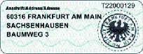 | Straße und Hausnummer | 25 Zeichen pro Zeile; 2 Zeilen (insgesamt 50 Zeichen) | Einträge in Schriftgröße 2 sind unzulässig |