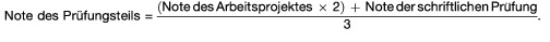 (3) Für die Bewertung des Prüfungsteils „Betriebs- und Unternehmensführung“ ist eine Note aus der Bewertung des Arbeitsprojektes (§ 11) und der Bewertung der schriftlichen Prüfung (§ 12) nach folgender Formel zu bilden: