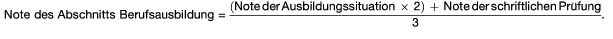 (4) Im Prüfungsteil „Berufsausbildung und Mitarbeiterführung“ ist zunächst eine Note für die Bewertung des Abschnitts „Berufsausbildung“ aus der Bewertung der Ausbildungssituation (§ 15) und der Bewertung der schriftlichen Prüfung (§ 16) nach folgender Formel zu bilden:
