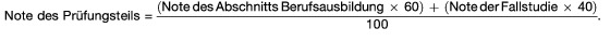 Anschließend ist für die Bewertung des Prüfungsteils „Berufsausbildung und Mitarbeiterführung“ eine Note aus der Bewertung der Leistung im Abschnitt Berufsausbildung nach Satz 1 und der Bewertung der Fallstudie (§ 17) nach folgender Formel zu bilden: