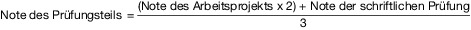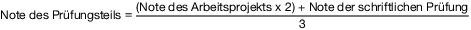 (3) Für die Bewertung des Prüfungsteils „Betriebs- und Unternehmensführung“ ist eine Note aus der Bewertung des Arbeitsprojekts (§ 10) und der Bewertung der schriftlichen Prüfung (§ 11) nach folgender Formel zu bilden: