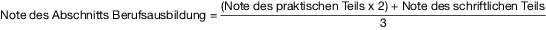 (4) Im Prüfungsteil „Berufsausbildung und Mitarbeiterführung“ ist zunächst eine Note für die Bewertung des Abschnitts „Berufsausbildung“ aus der Bewertung des praktischen Teils (§ 14) und der Bewertung des schriftlichen Teils (§ 15) nach folgender Formel zu bilden: