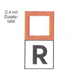 | 1. | Die Grenzen der Reeden werden am Ufer durch das Tafelzeichen C.4 (Anlage 7) mit einer quadratischen weißen Zusatztafel mit dem Buchstaben "R" bezeichnet; gegebenenfalls kann das Zeichen durch eine dreieckige weiße Zusatztafel ergänzt sein, auf der in schwarzen Zahlen die Länge der Reede angegeben ist. |  |