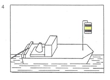 | | einen gelben Zylinder, der oben und unten mit je einem schwarzen und je einem weißen Streifen - letztere an den äußeren Enden - eingefaßt ist. Der Zylinder muß auf dem Vorschiff senkrecht und so hoch gesetzt werden, daß er von allen Seiten sichtbar ist. |  |