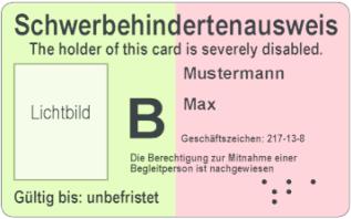 (2) Ist der schwerbehinderte Mensch zur Mitnahme einer Begleitperson im Sinne des § 229 Absatz 2 des Neunten Buches Sozialgesetzbuch berechtigt, sind auf der Vorderseite des Ausweises das Merkzeichen „B“ und der Satz „Die Berechtigung zur Mitnahme einer Begleitperson ist nachgewiesen“ einzutragen.