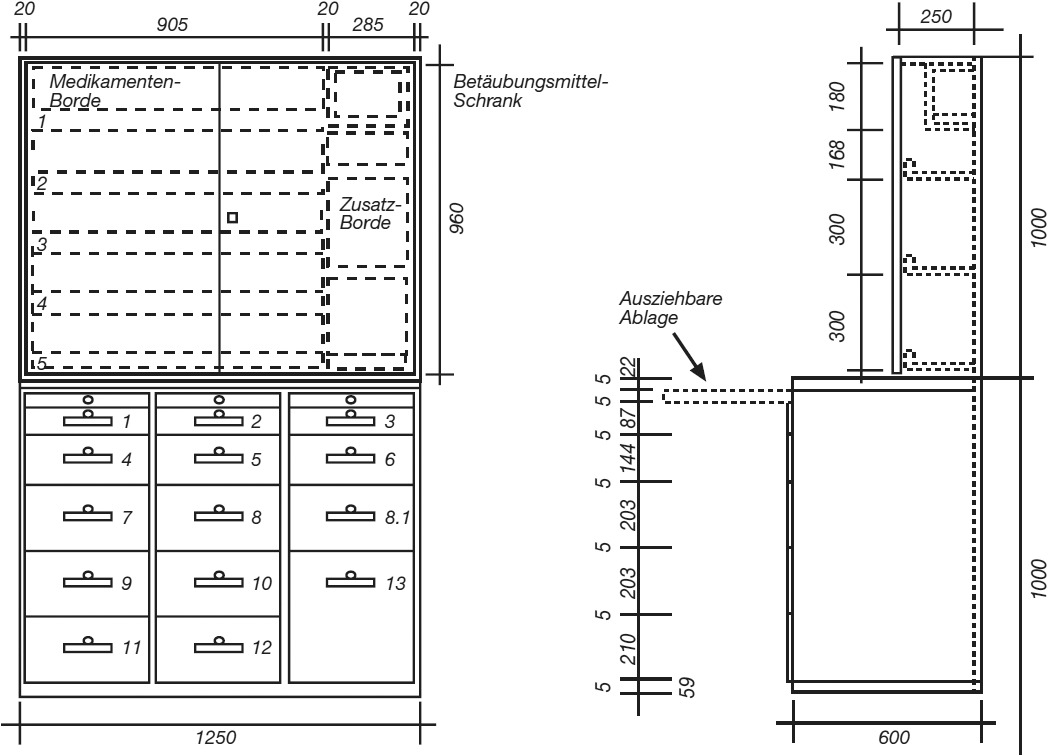 Das Oberteil muss 250 mm tief sein und fünf Medikamentenborde enthalten. Es muss durch zwei Türen, Falttüren oder Rolltüren abschließbar sein. Die Medikamentenborde sollen den in Landapotheken-Einrichtungen bewährten, in der Aufteilung variablen Medikamenten-Borden entsprechen.