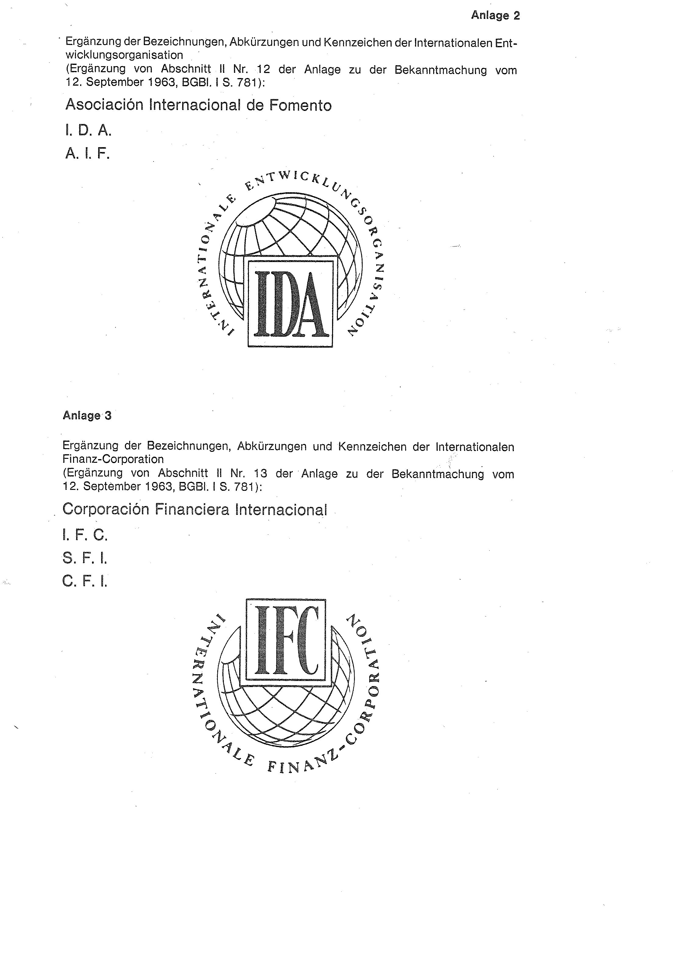 Ergänzung der Bezeichnungen, Abkürzungen und Kennzeichen der Internationalen Entwicklungsorganisation (Ergänzung von Abschnitt II Nr. 12 der Anlage zu der Bekanntmachung vom 12. September 1963, BGBl. I S. 781):